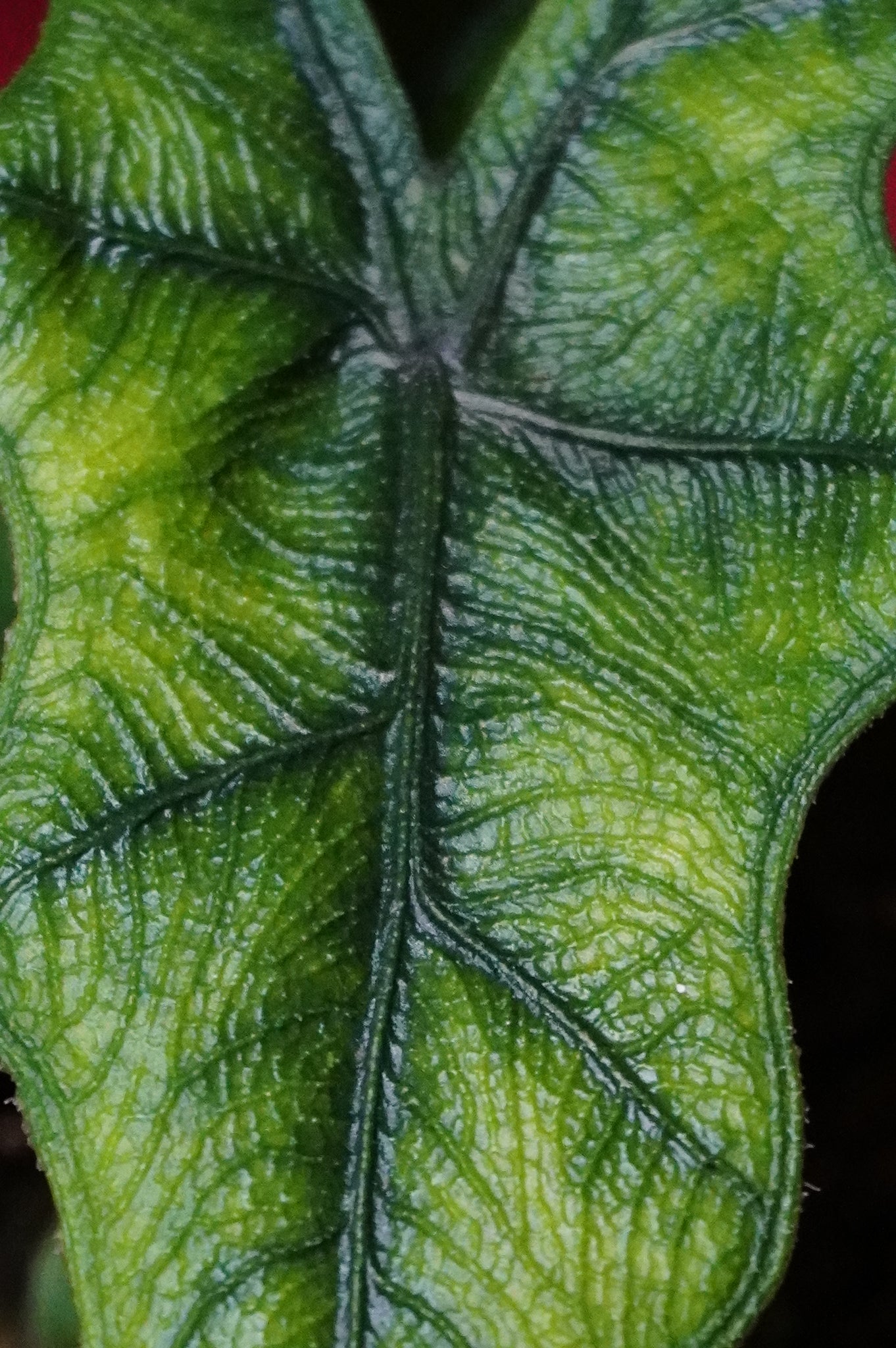 - Foliage: Vibrant green leaves with textured, dark, zebra-like vein patterns.