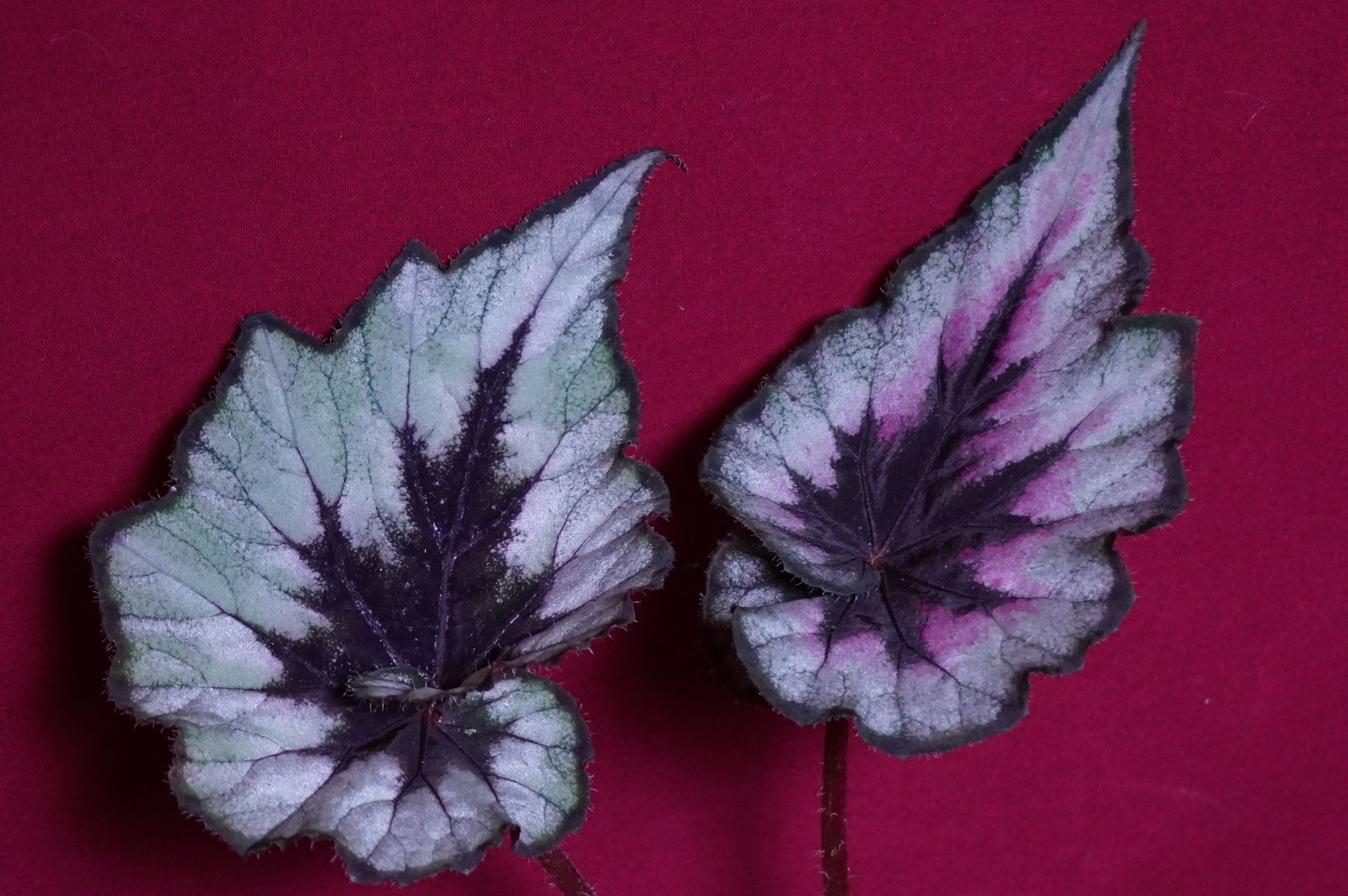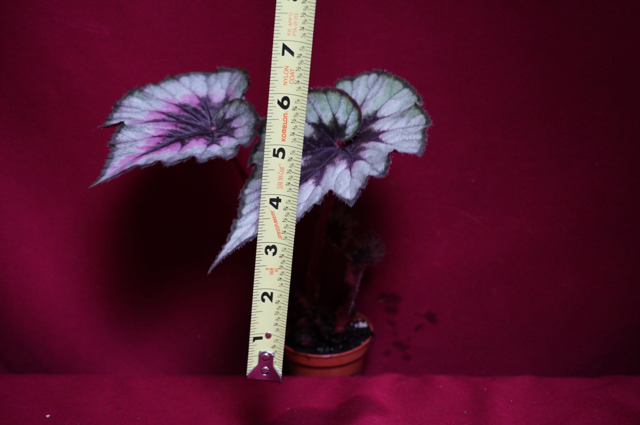 Our first rex begonia hybrid. SOAK's Silver Panther is a large sized hybrid with silver and grey markings. A pink blush is common in cooler weather. Leaves can be up to about 12" across, and have a swirl to them. Occasionally double swirls are produced. Picture 2 shows our parent plant for reference.