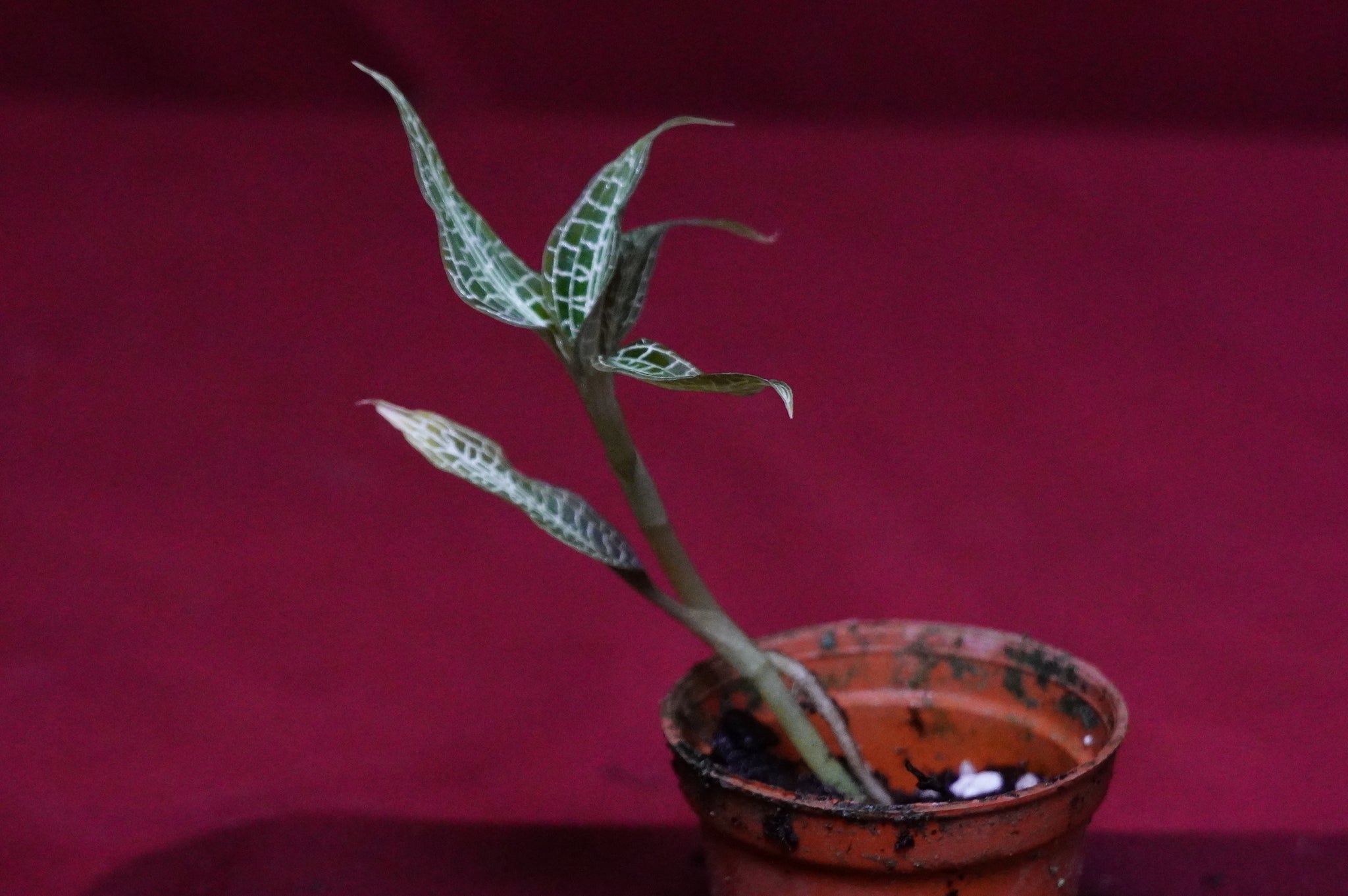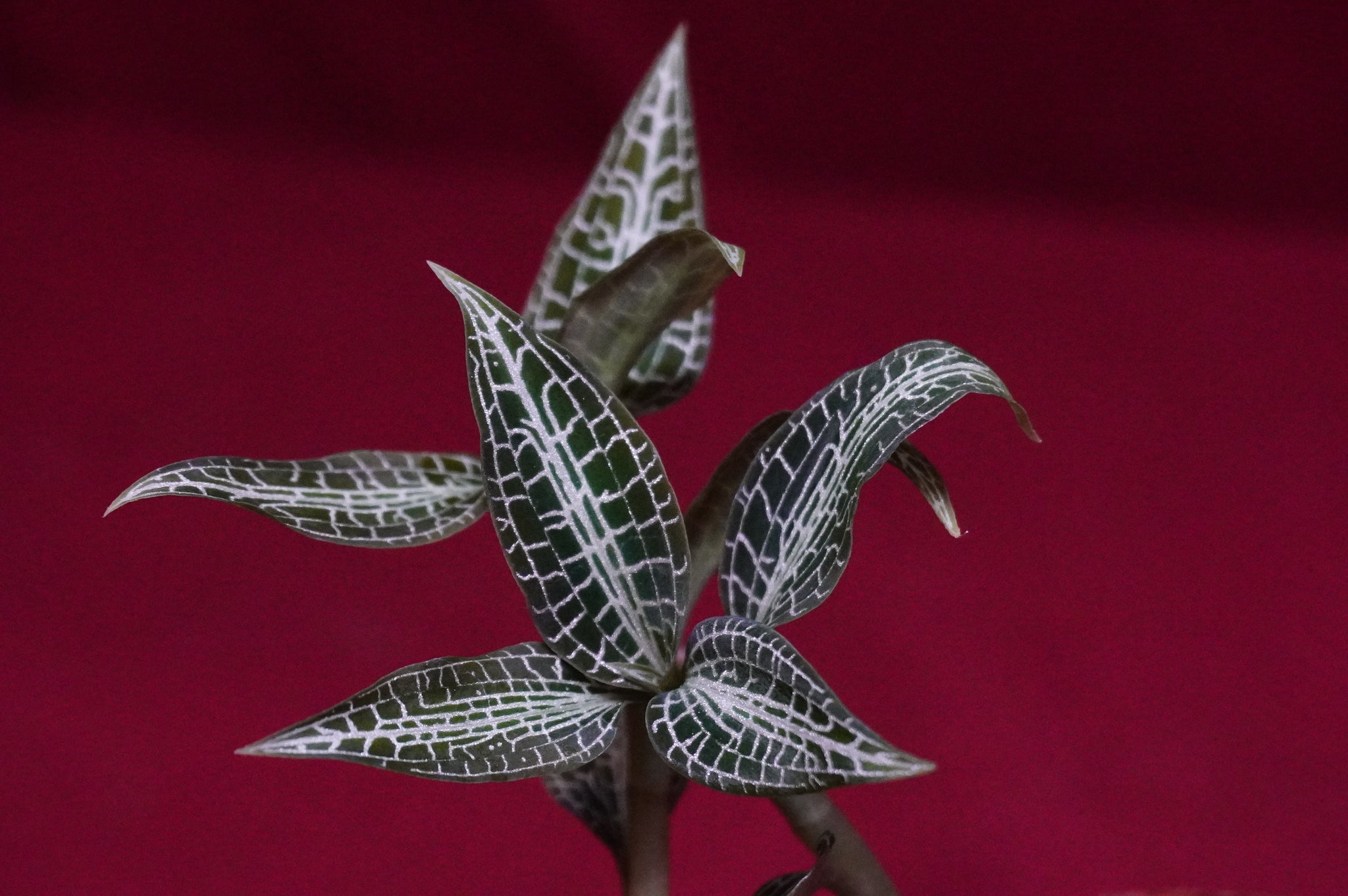 - Foliage: Small, dark green velvety leaves with prominent silver, pink-flushed veins.