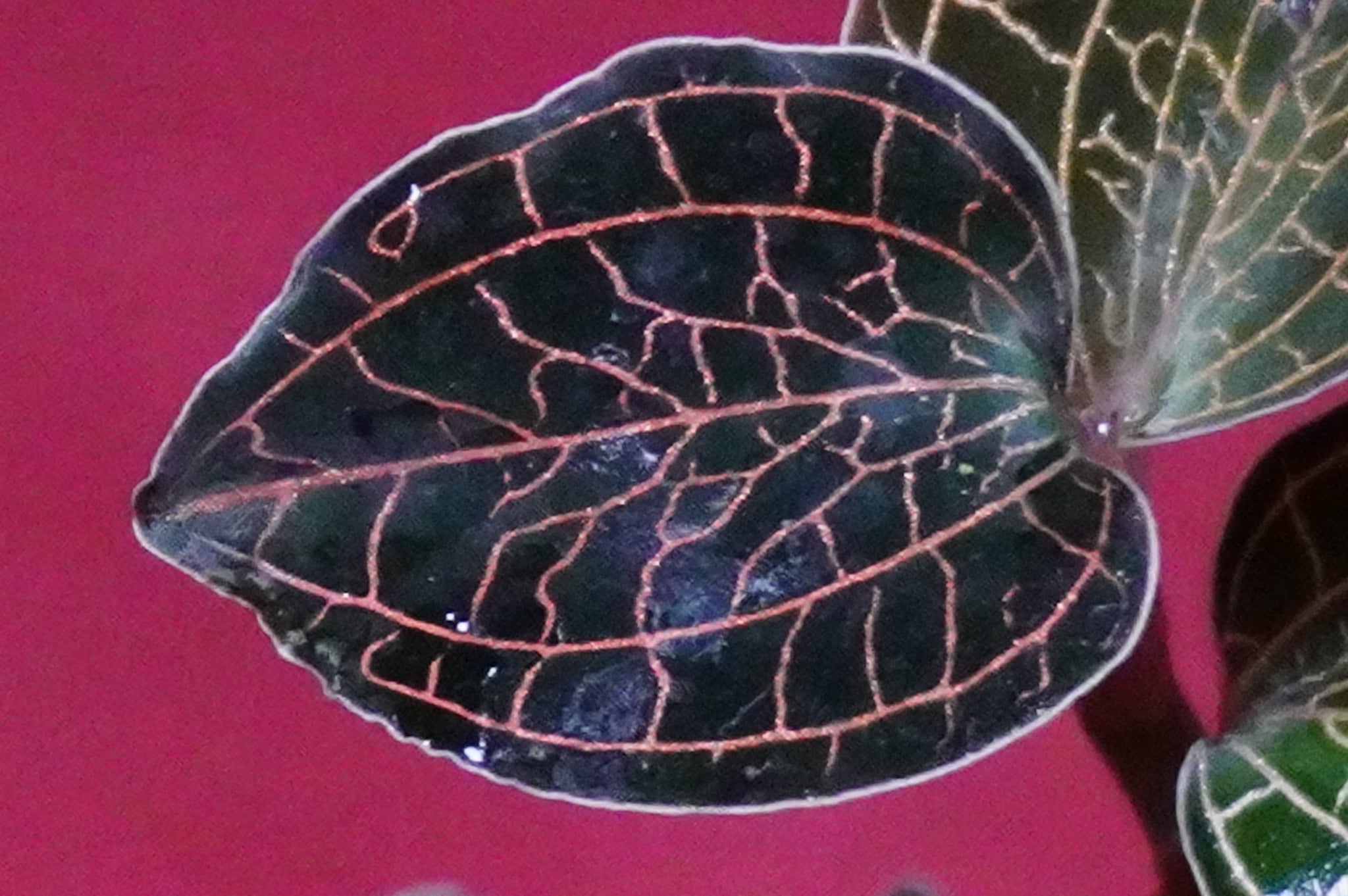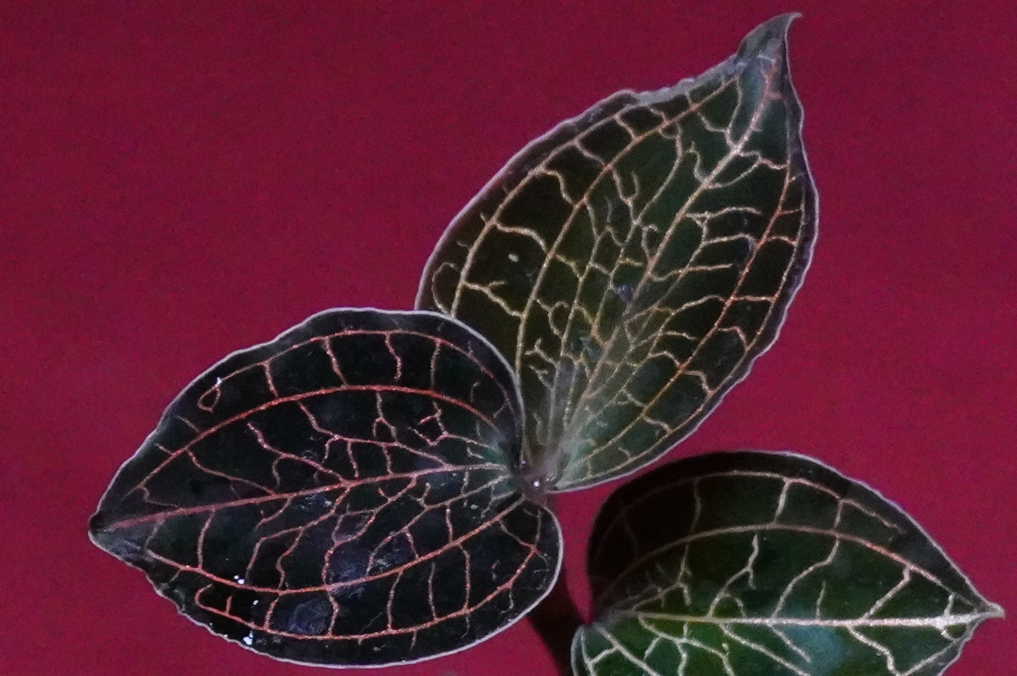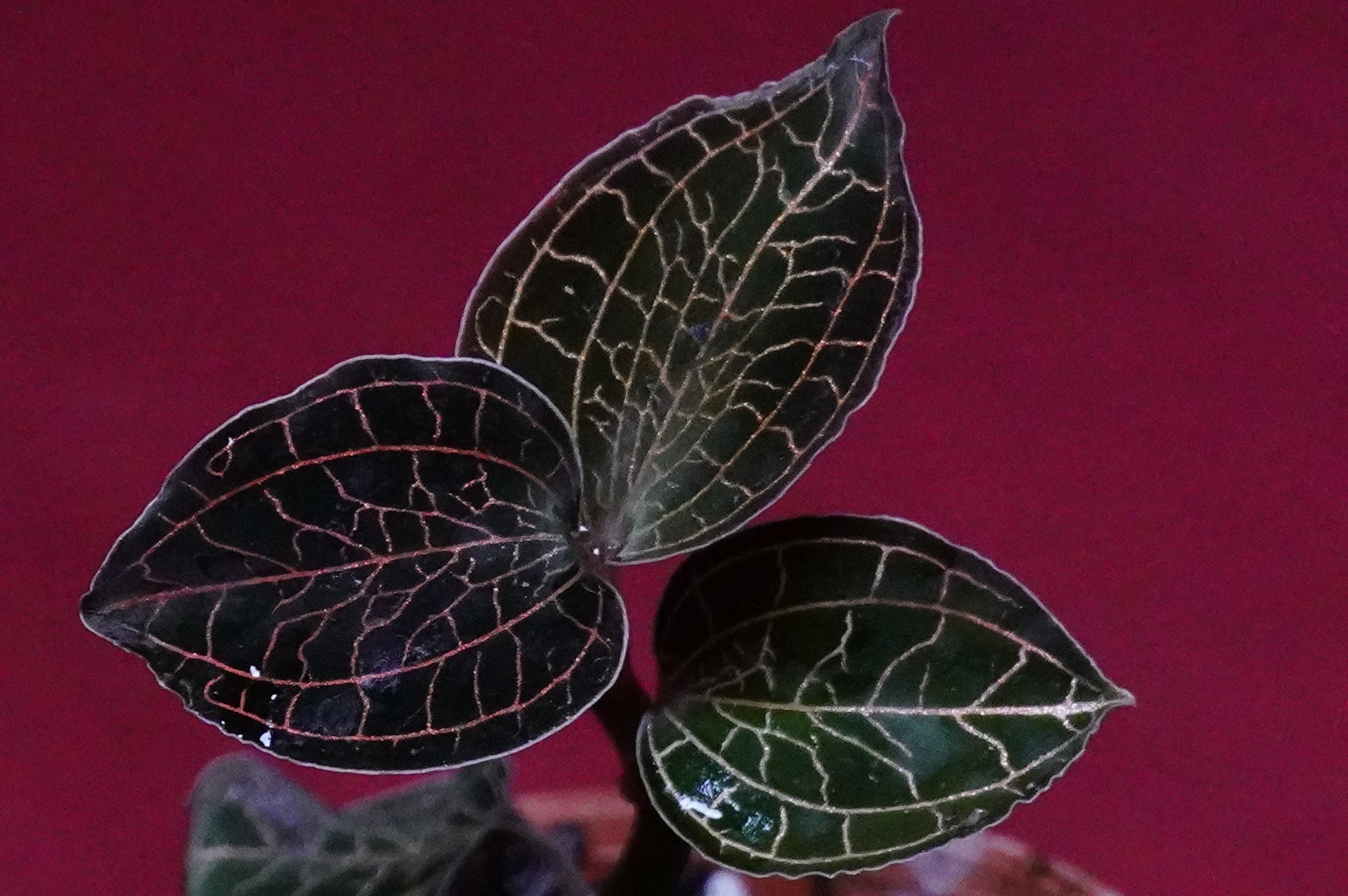 - Foliage: Deep maroon-green to blackish leaves with glistening, contrasting veins.